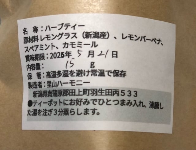 地元、新潟県田上町で自然体験活動や民泊などを精力的に展開されている里山ハーモニーさんのお茶です。レモングラス・レモンバーベナ・和ハッカ、カモミールの香りの良さにこだわって厳選したハーブを贅沢にブレンドしました。爽やかな香りと味わいは、心と体をリフレッシュしたいときにぴったりの一杯です。