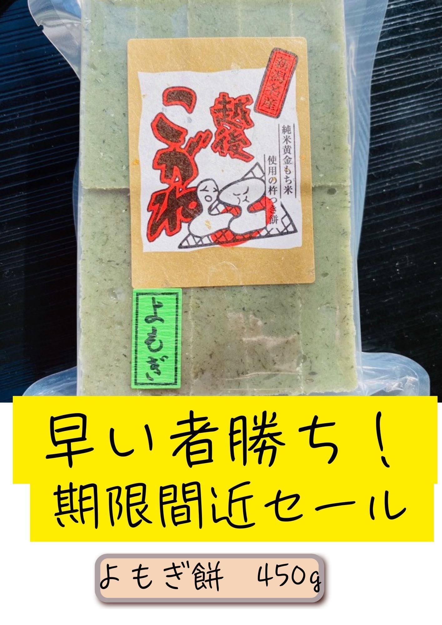 「早い者勝ち!杵つき 越後こがねもち よもぎ餅450ℊ(10個入り)」です!